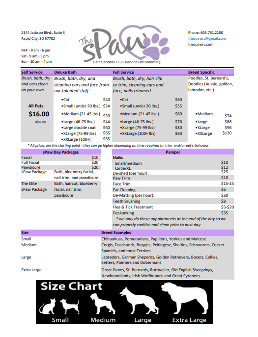 Below is the price list for our services. If you prefer full service please call (605) 791-2150 to schedule your appointment as time needed varies by services requested. For self service you can call in or schedule your appointment online.